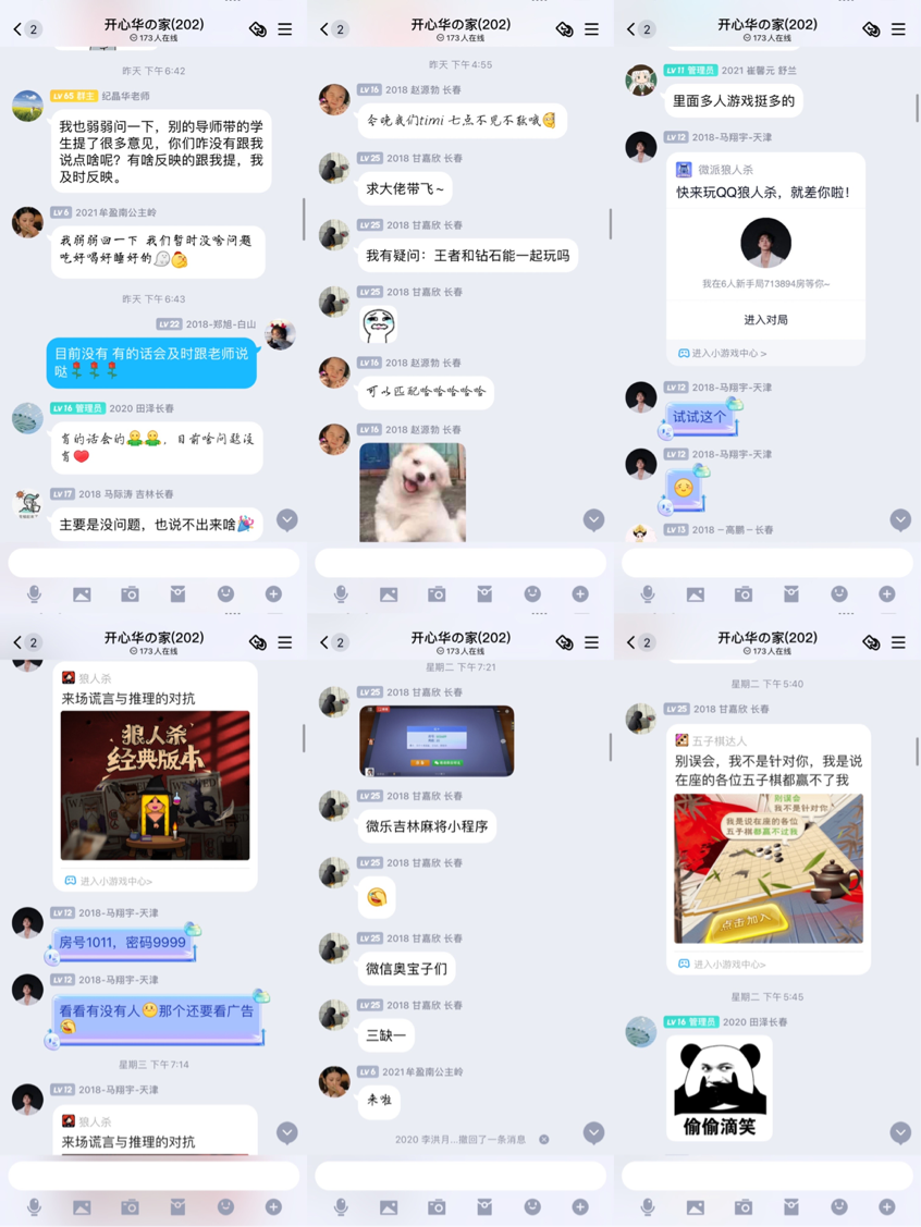 在学弟学妹们上完一天的课程之后,学姐学长们收集意见。我们尝试了狼人杀、扑克牌、王者荣耀等,还有一些新的活动有待发掘。在活动中我们认真讨论、交流,既要动脑更要学会团队合作。有些已经毕业的学长学姐也加入了我们的活动。疫情虽然让我们停留在各自的空间中,但是每天半个小时欢乐时光却增进了我们之间心的距离,成为了大家每天的期盼。