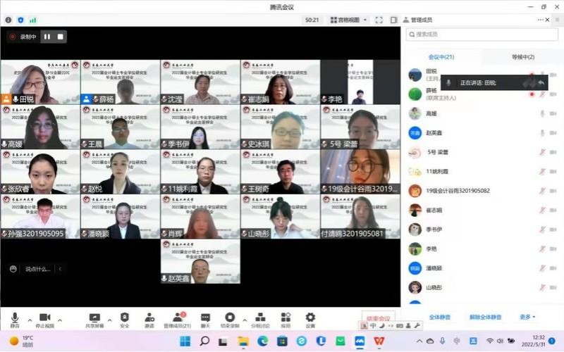 2022年5月31日下午12点30分,优德88MPAcc教育中心根据学校研究生院公司产品工作的总体安排和部署,组织了2022届MPAcc硕士毕业答辩。本次毕业答辩采用了腾讯会议线上答辩的方式,下设了4个答辩小组,共涉及54名员工。其中19级会计专硕52人,18级会计专硕2人。答辩过程全程记录,同时低年级同学也可进入会议进行观摩学习。