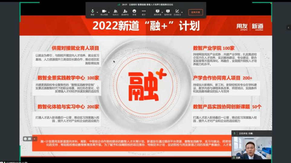 随后,新道科技股份有限公司副总裁田鹏指出数智商业融入校园的路径,他表示数智时代的教育改革,比任何时候都更需要产教融合。在数字营销域,需要培养了解场景、同时熟练使用数字技术的营销和经营人才;在数字人力域,需要培养新生代数字化人力资源人才;在金融科技域,需要培养产业场景+金融场景+金融技术型融合运营和营销类人才;在工业互联网和计算机域,需要培养工管交叉型人才。随后,他代表新道科技发布《2022新道“融⁺计划”》。