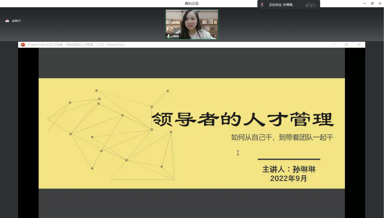 公司网讯(通讯员 王静)凝聚员工力量、传承经管文化、学习榜样精神、助力学子成才,2022年9月14日18:30,员工论坛2022年第9期在腾讯会议端举行,优德882002级员工孙琳琳作了题为“领导者的管理人才——如何从自己干,到带着团队一起干”的报告。学院部分教师、本科以及研究生同学参加了论坛。论坛由副经理黄鑫昊主持。