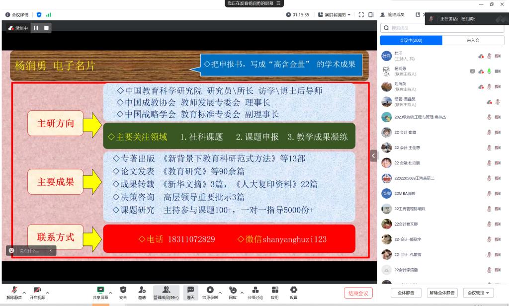 刘海英隆重介绍了主讲嘉宾。杨润勇长期致力于“有效课题”研究,曾任中国教科院科研处长多年,具有丰富的各级各类科研管理经历。十几年来,在全国各级课题研究培训交流活动中多次担任课题申报主讲专家,参与、指导各级各类课题数千人(次)。近年来,出版《新时期教育科研的范式与方法》等专著13部,在《教育研究》《中国教育报》等期刊(报)公开发表论文90余篇,其中《新华文摘》全文转载3篇,人大复印资料全文转载20余篇。主持各级各类课题近百项,3篇研究报告分别得到国家领导人、教育部主要负责同志的重要批示。